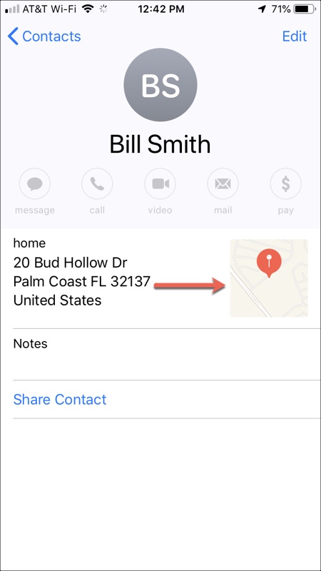Harita bulunduğunuz yere taşınacak ve adres alttaki pencerede görüntülenecektir. Yukarı kaydırın ve adresi mevcut bir kişiye eklemek veya yeni bir tane oluşturmak için yukarıdaki adımları izleyin.