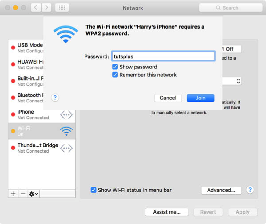 Listeden Kişisel Hotspot Wi-Fi ağ adını seçin ve Wi-Fi şifresini girin. Bluetooth ile bağlanmak istiyorsanız, Mac ve iOS cihazını eşleştirin.