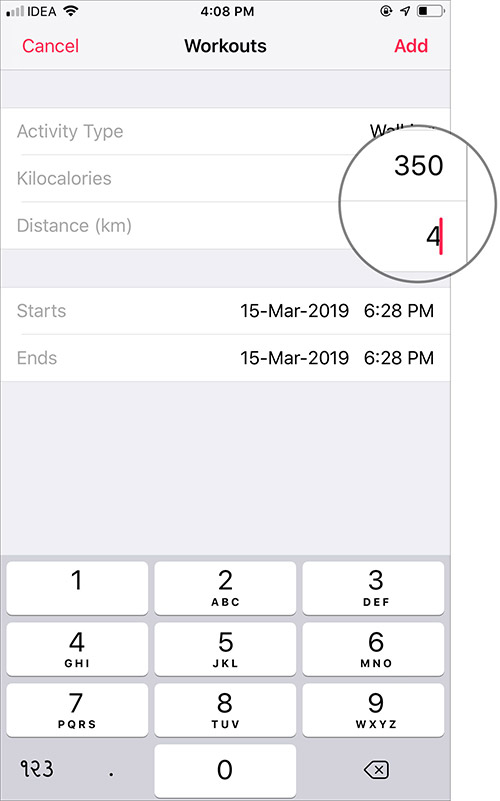 6. adım Sonra, Kilokalori ve Uzaklık üzerine dokunun; İki seçenek, bu atlıkarınca, rakam ekleyebilmeniz için sayısal bir ped ile değiştirilecektir.