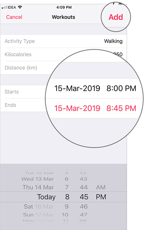 Adım 7 Şimdi, aktivitenizi başlatıp bitireceğiniz zamanı ekleyin ve ardından telefon ekranınızın sağ üst köşesindeki Ekle düğmesine dokunun.