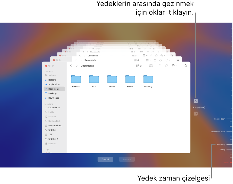 macOSin yerleşik yedekleme aracı olan Time Machine, harici bir depolama aygıtına düzenli olarak yedekleme yapmanızı sağlar. Sistem Ayarları > Time Machine bölümünden ayarları yapılandırabilirsiniz .